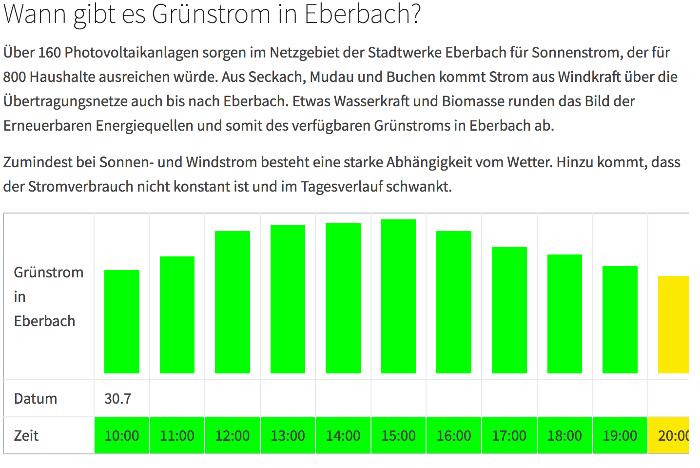 Im Praxispiloten wurde im Projektzeitraum April bis Juni 2019 der Cloud-basierte GrünstromIndex mit Hilfe der badenIT mittels API erfolgreich in die IT-Landschaften der Stadtwerke Eberbach und Tübingen integriert.